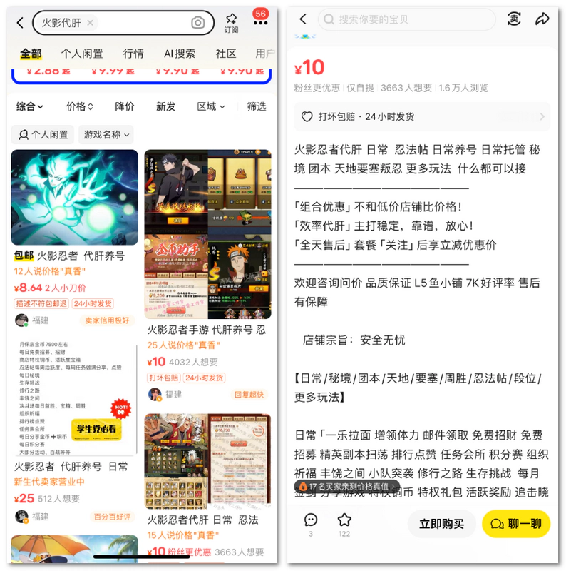 火影忍者全自动练号打金项目,是专为追求高效收益的玩家设计的。通过该项目,您可以快速起号、练号并出售,一般一周左右即可完成一批账号的培育。根据对5173、交易猫等游戏交易平台的观察,单个账号的市场售价大约在70元左右,收益可观。