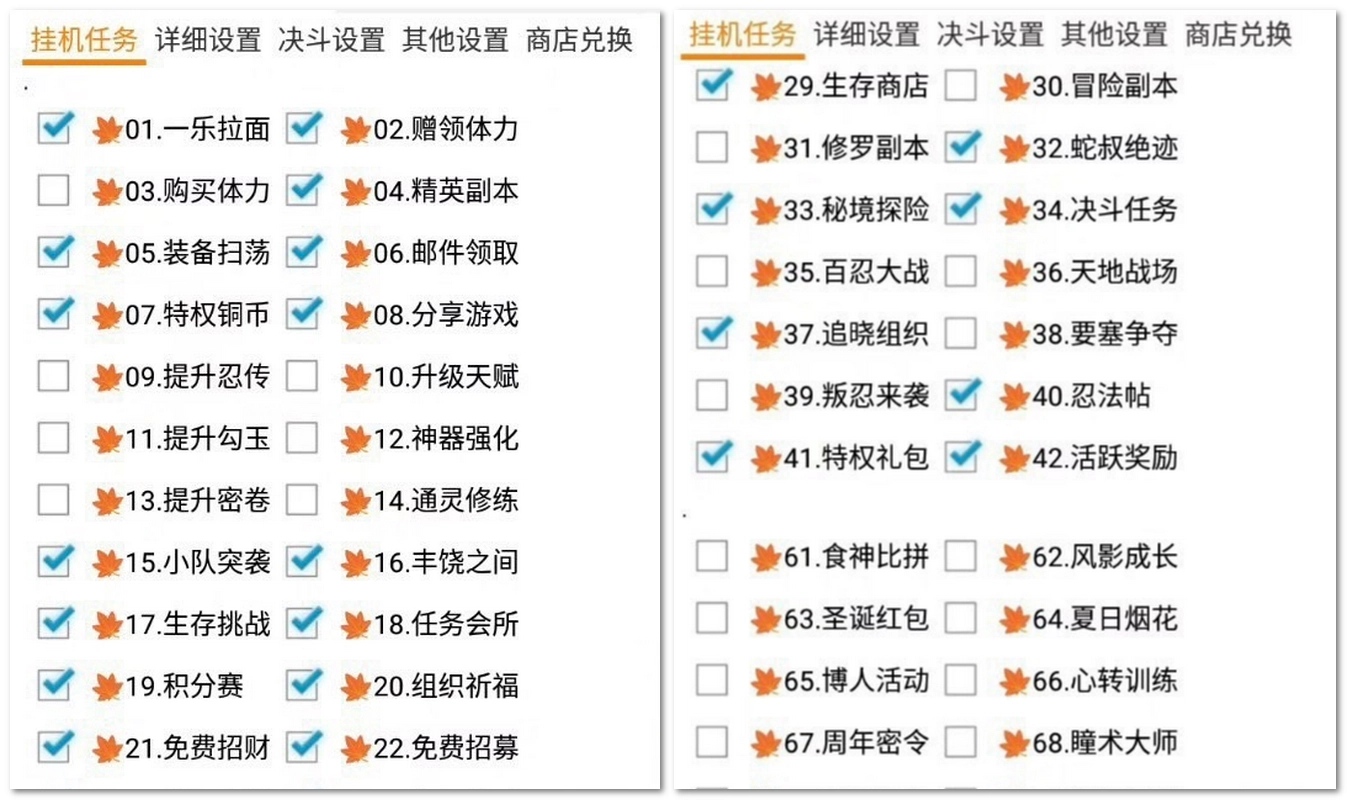 该脚本功能强大,几乎涵盖了火影忍者游戏中的所有日常活动。从全自动做日常任务、决斗场挑战,到兑换奖励、每日分享,再到好友体力互助、排行点赞等,一应俱全。此外,脚本还支持免费招财、免费招募、组织祈福、修行之路、生存挑战等多种玩法,让您的游戏之旅更加丰富多彩。