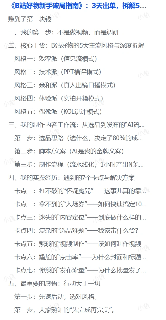 总结:本文为B站好物新手提供3天出单攻略,涵盖5大主流风格、选品思路、脚本创作及制作流程,强调选对风格、积极行动并借助AI,助力新手快速入门盈利。