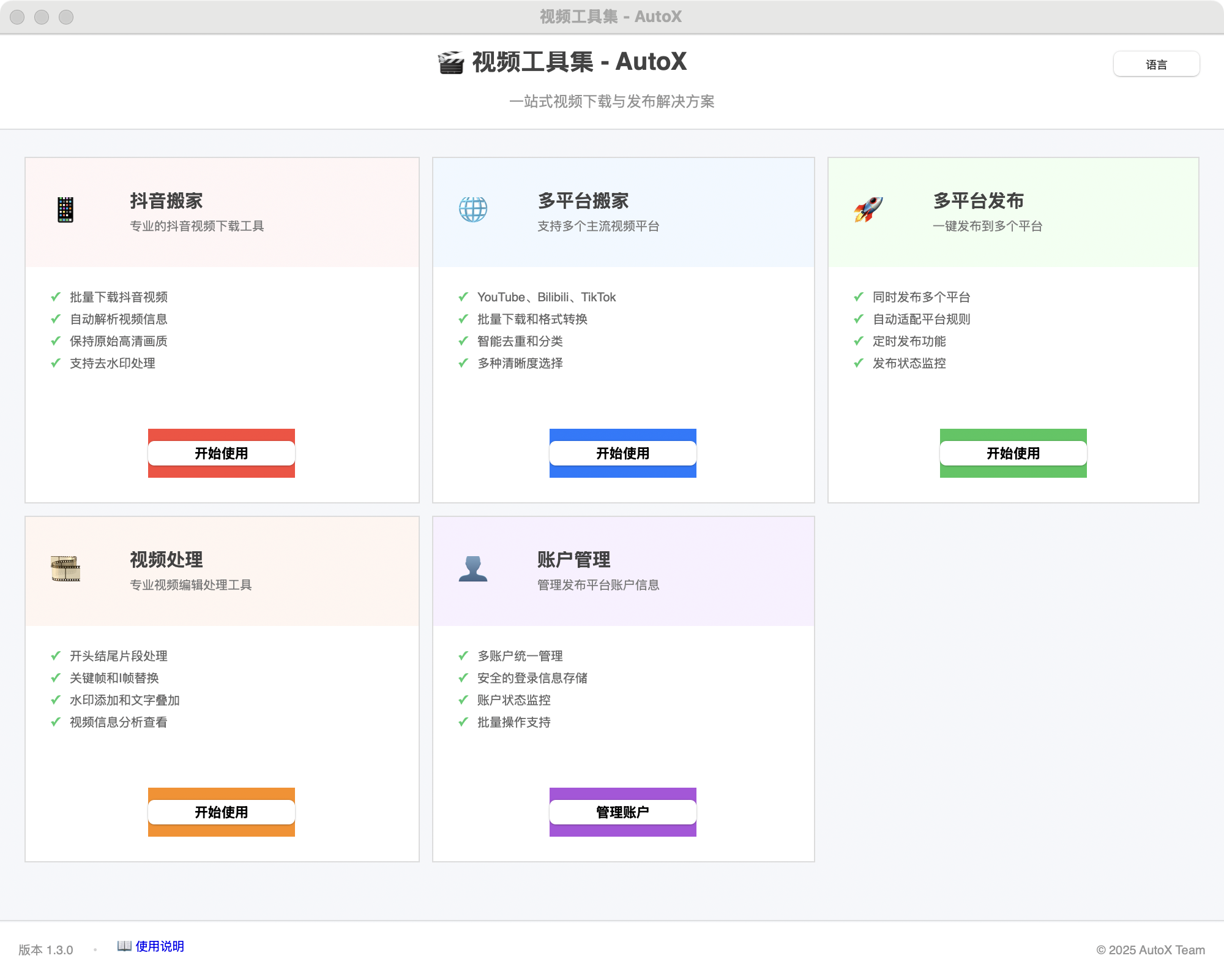 除了基本的发布功能外,AutoX还具备视频处理、批量处理、账号管理以及登录状态检查等多种实用功能。这些功能使得自媒体人在管理视频内容时更加得心应手,无论是视频的剪辑、格式转换,还是多账号的统一管理,都能通过AutoX轻松完成。