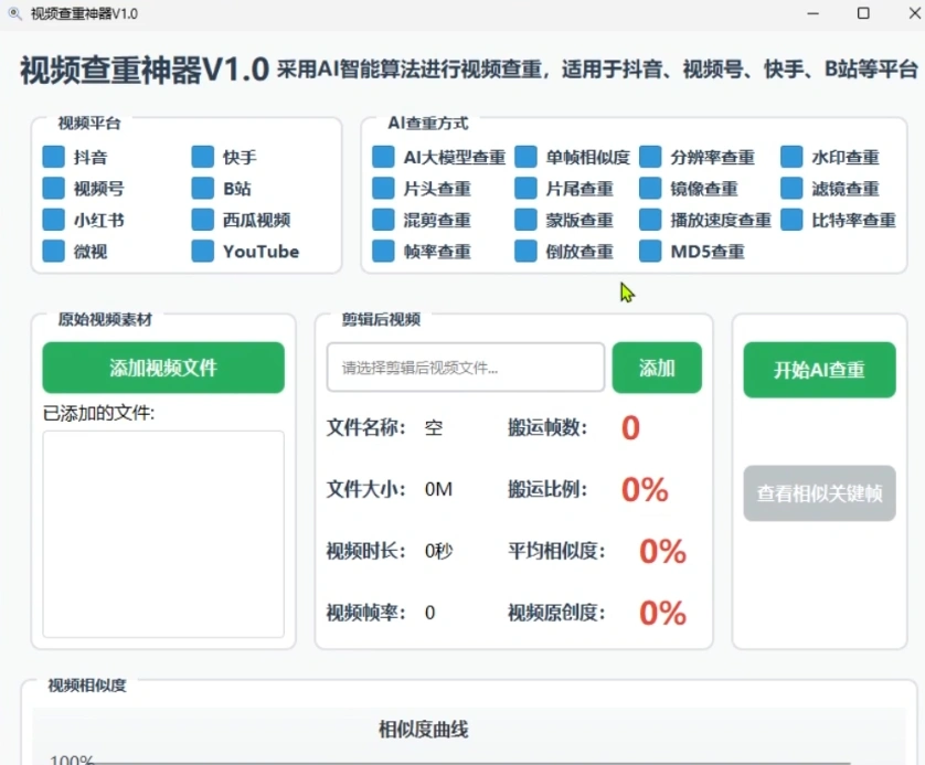 总结:AI视频查重工具是自媒体混剪创作者的得力助手,它功能全面,支持多平台查重,能自动计算原创度,一键添加视频即可批量检测,并输出相似度曲线,帮助规避搬运风险,提升视频原创度。