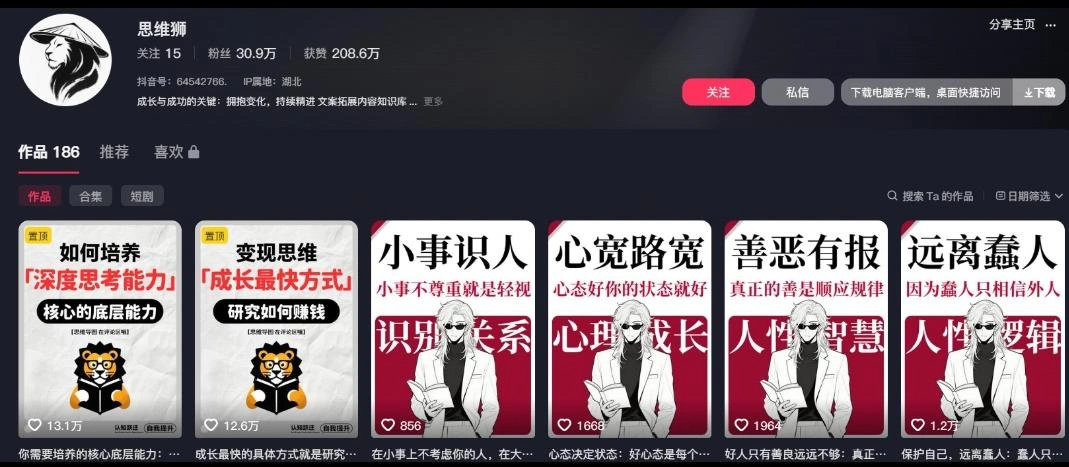 以玄川近期发现的一位博主为例,他凭借186个作品,成功吸引了30.9万粉丝,累计获赞高达280.6万。平均每条作品的点赞量都轻松过万,最高点赞更是达到了惊人的13.1万。这种火爆现象并非偶然,而是有其独到之处。