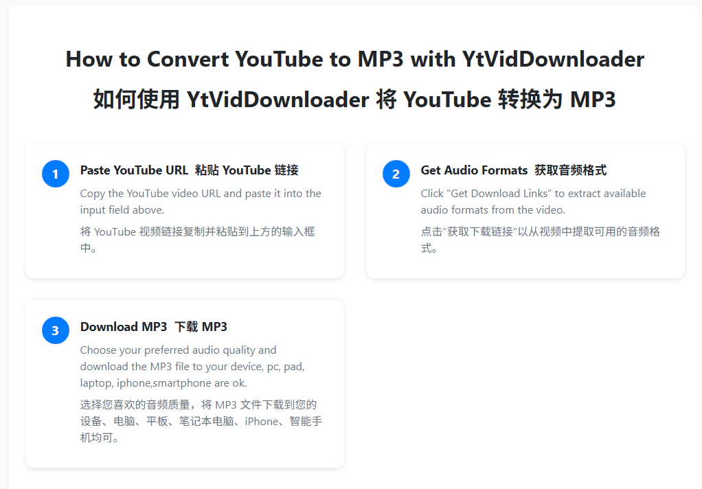 YtVidDownloader 作为一款优秀的 YouTube 转 MP3 转换器(下载器),具备高品质音频、快速转换、安全私密、多平台适用、100%免费以及无限制转换等诸多优势。使用方法简单便捷,能让你轻松将 YouTube 视频转换为 MP3 音频文件,满足你的多样化需求。