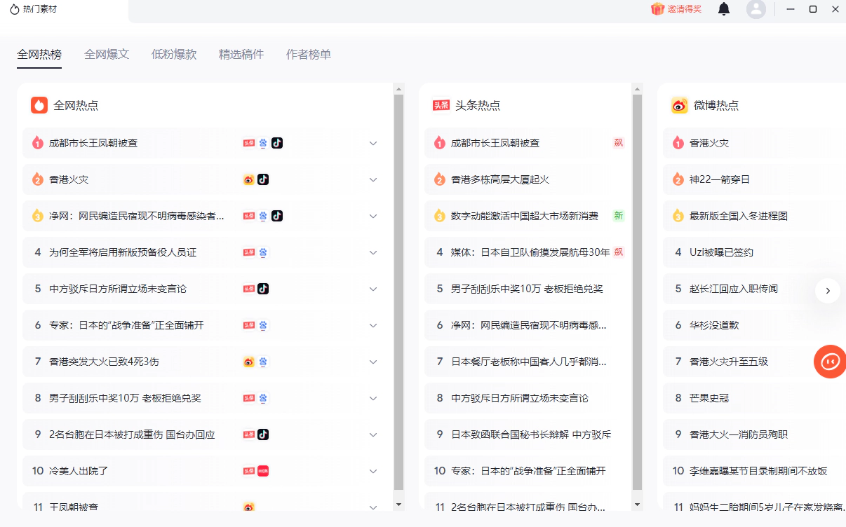 - 全网爆文追踪:覆盖今日头条、百度、小红书、抖音等主流平台,实时追踪全网爆文及热点,同步点赞、收藏、转发数据。支持领域及关键词精准检索,为创作者提供源源不断的创作灵感。
