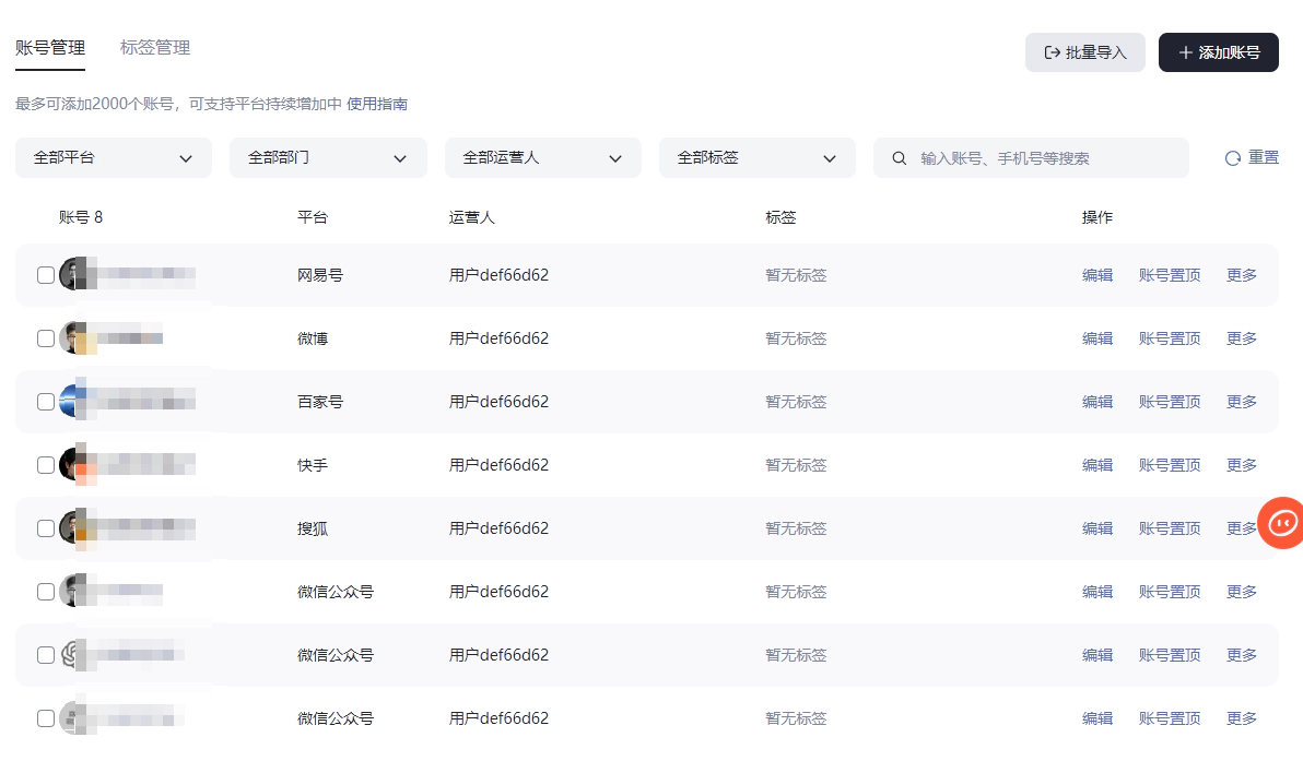 - 账号管理高效便捷:一键管理 60 + 平台,超 1000 个账号同屏操作。跨平台数据实时同步,数据看板实时追踪阅读量、粉丝增长趋势,让创作者对账号情况一目了然,效率翻倍提升。