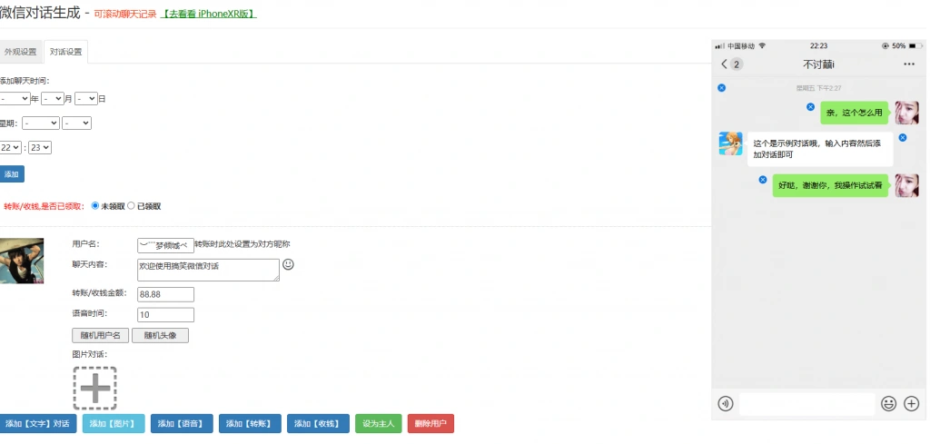 值得一提的是,这款工具免费使用,无需注册,在线即可操作。打开网站,就能立刻开启你的截图生成之旅,轻松制作出各种转账截图和聊天对话。