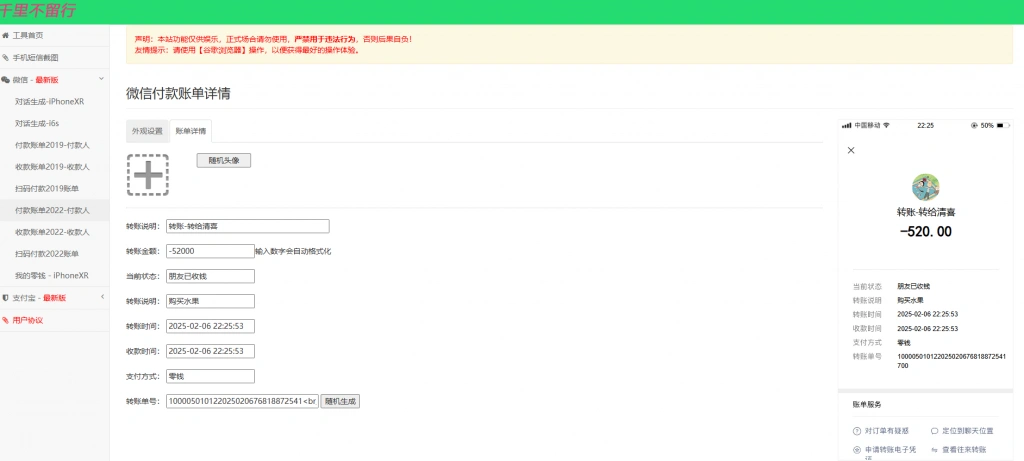 该工具功能极为强大且全面,支持生成多种类型的截图。无论是微信和支付宝的聊天记录,让你可以随心设计有趣的对话场景;还是收付款账单,清晰呈现每一笔交易的详情;亦或是扫码付款、零钱、余额、商品付款等截图,都能一键生成,满足你在不同场景下的使用需求。