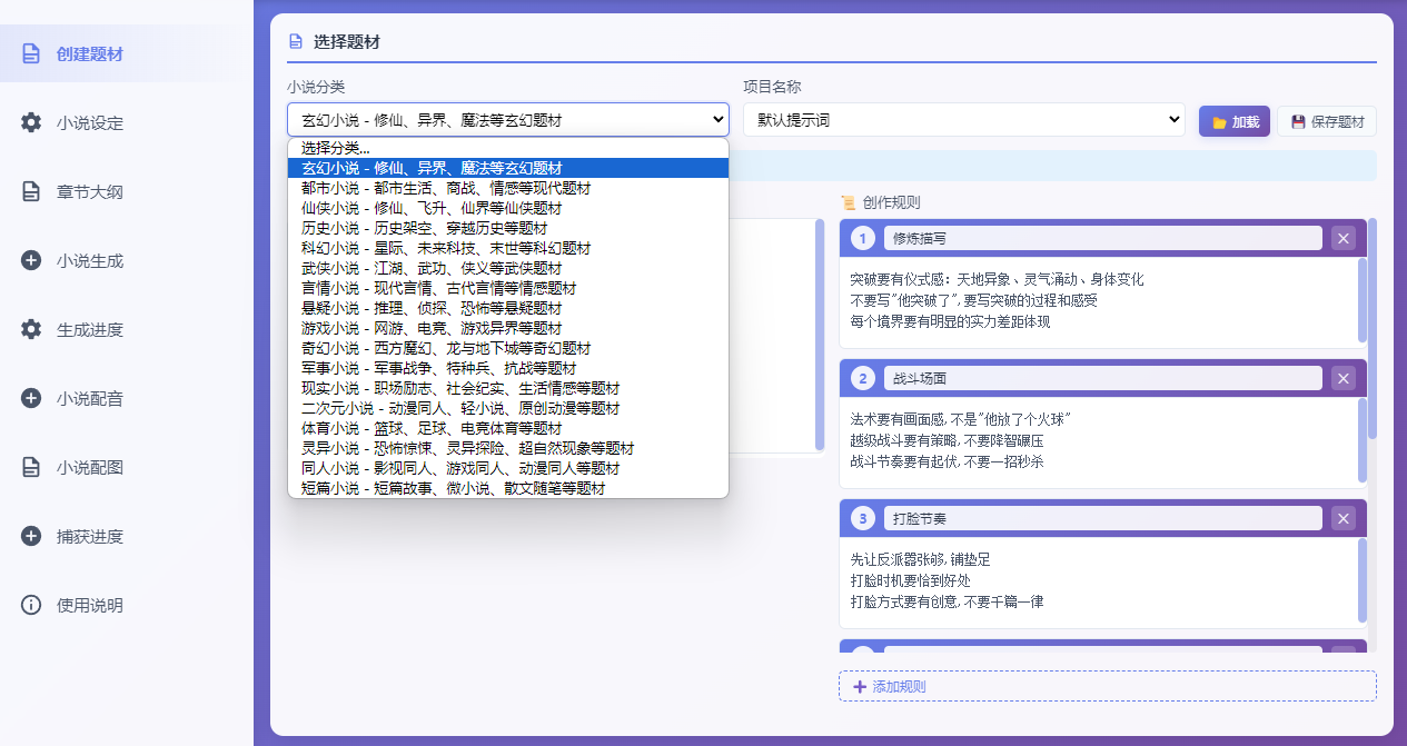- 配置提示词:在提示词管理页面创建项目,配置作者角色、创作规则等提示词模板,为AI创作提供指导。