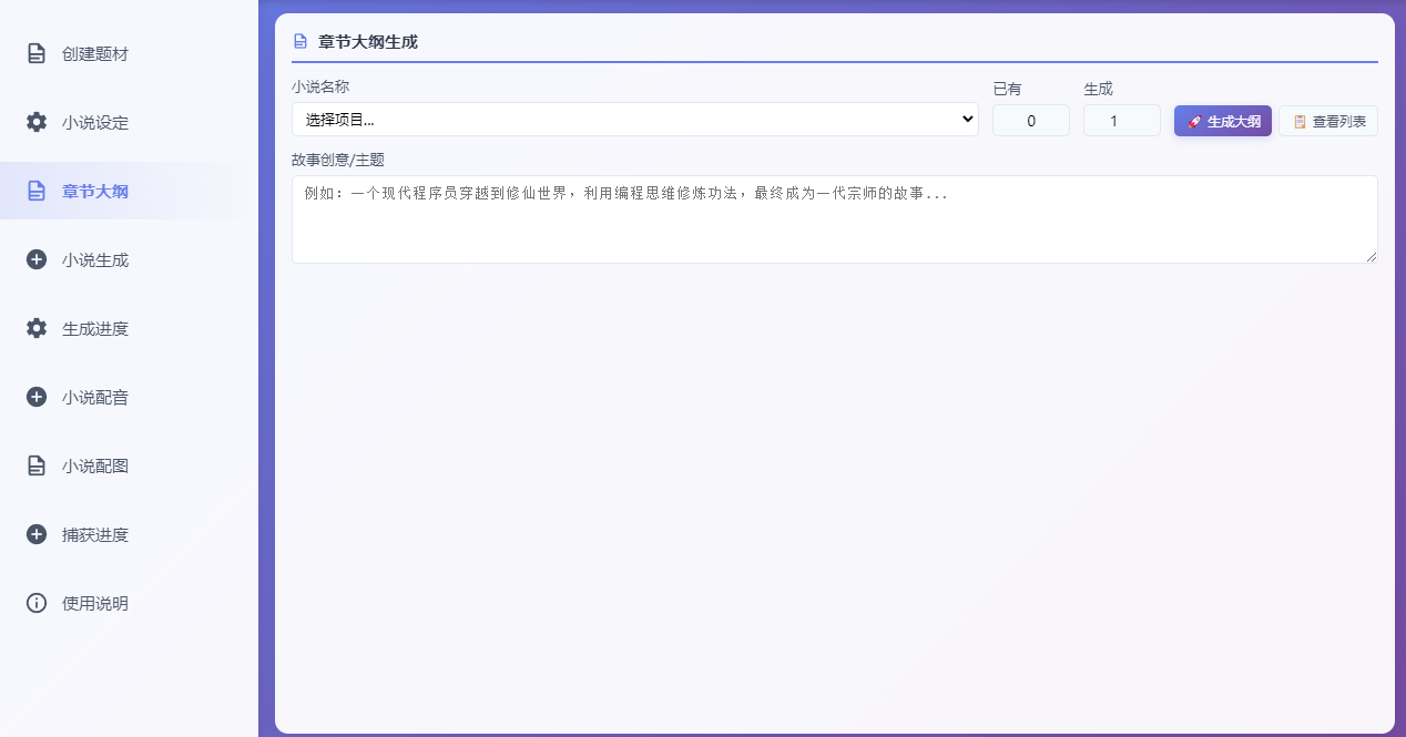 - 生成章节大纲:输入故事创意,AI自动生成章节大纲,为后续创作奠定基础。