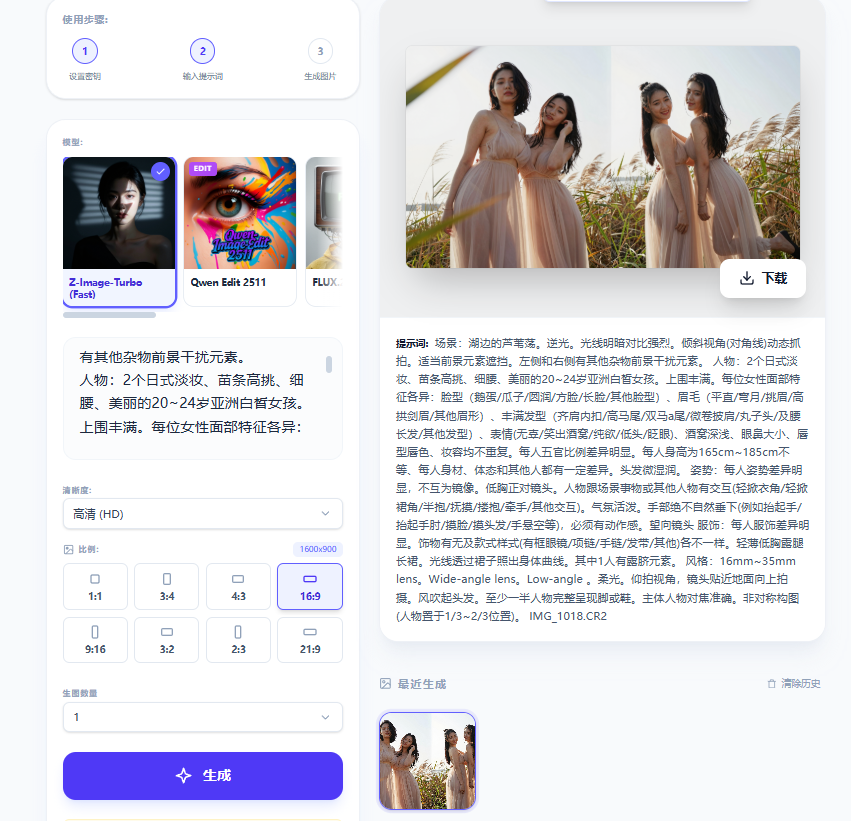 Z-Image-Turbo最大的亮点在于其使用的阿里最新Z-Image-Turbo模型。只需轻轻一键,就能快速生成真实细腻的图像,效果逼真到让人惊叹。而且,它是在线免费使用的,无需繁琐的安装过程,甚至连API都不需要,真正做到了即开即用,为用户节省了大量的时间和精力。