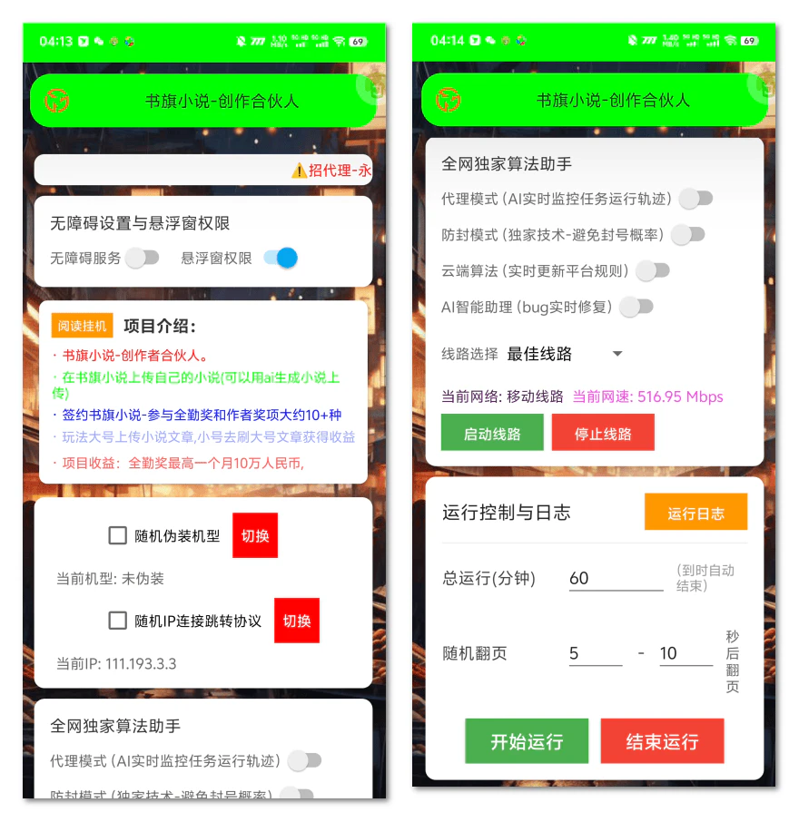 在网文平台流量竞争加剧的背景下,书旗小说推出的创作者激励计划成为低门槛副业的新风口。本项目利用平台对原创内容的流量扶持政策,通过全自动挂机阅读脚本实现“睡后收益”,无需人工值守,单账号日收益稳定在1-3元,适合新手及工作室批量操作。