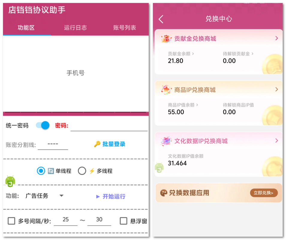 • 全自动:账号密码登录,支持批量账号,点击“开始”即自动模拟真人看广告,无需人工干预。