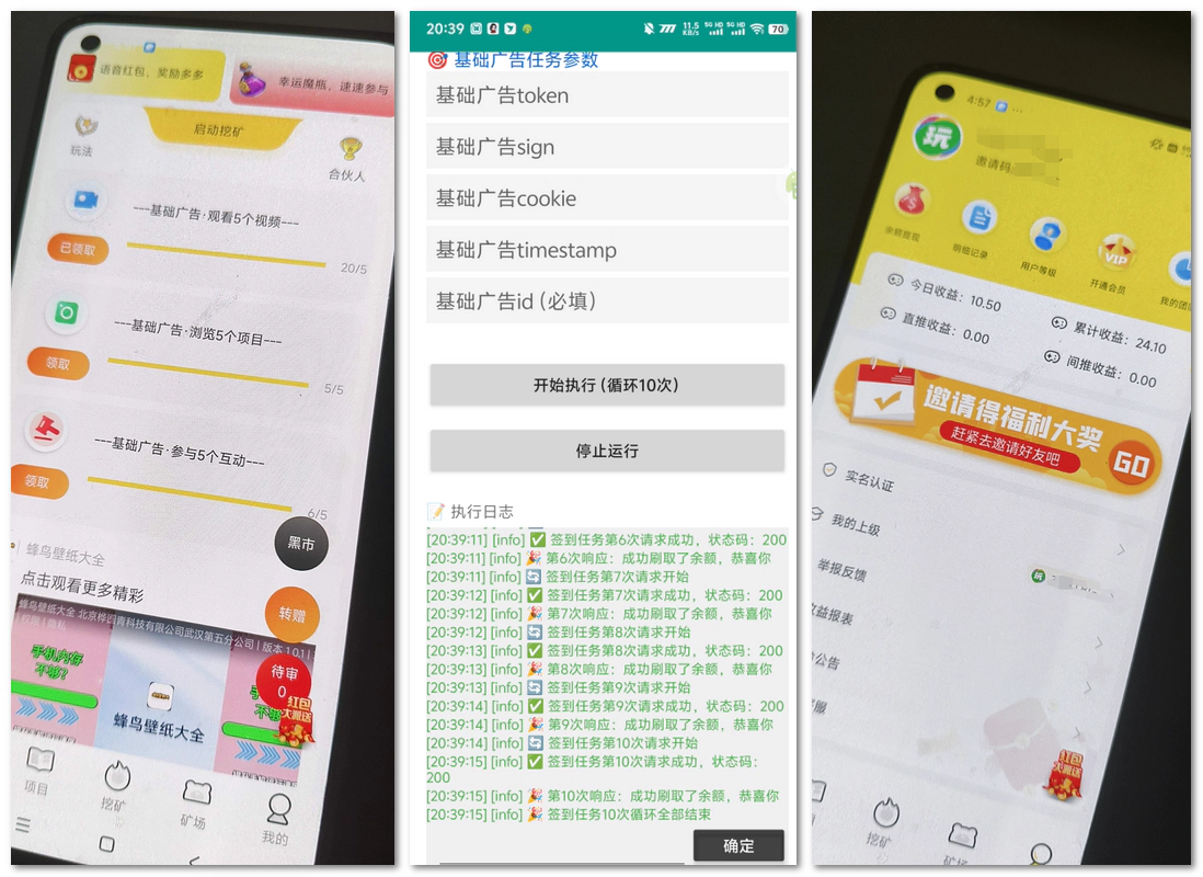 趣玩平台的余额获取完全依赖广告观看量(官方1广告=对应余额),而协议脚本的作用是自动化批量刷广告,无需手动操作即可完成官方3倍以上的广告量。对于想通过挂机赚零花钱的用户来说,这是提升单号收益的关键手段。