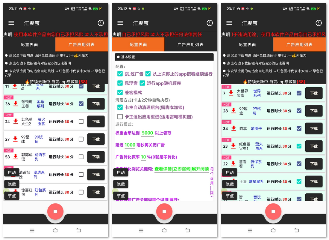 汇聚宝58+小游戏广告打金脚本:安卓手机全自动挂机撸金币攻略