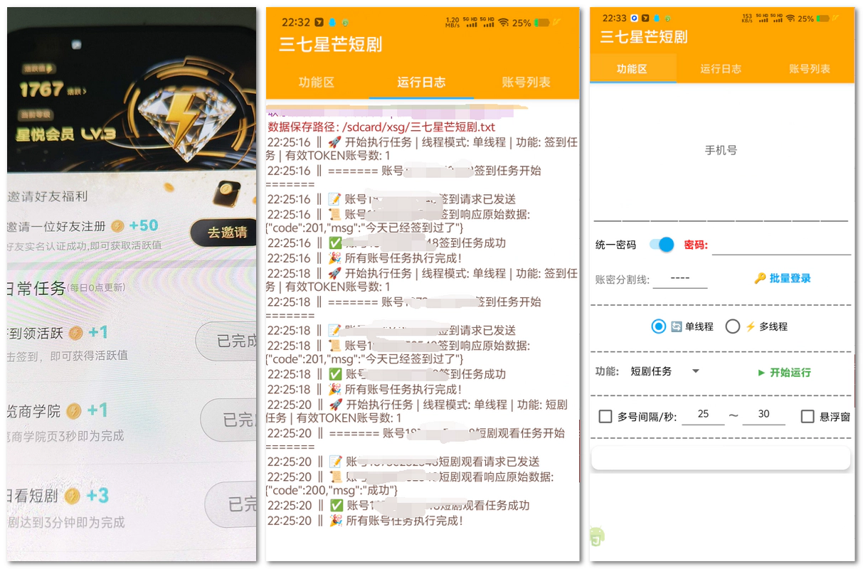 项目基于三星七星短剧的任务机制,通过协议软件模拟正常用户行为(如签到、刷剧、互动等),用户只需提供手机号+密码登录账号,软件即可全流程自动运行,无需手动操作,真正实现“躺平挂机”。