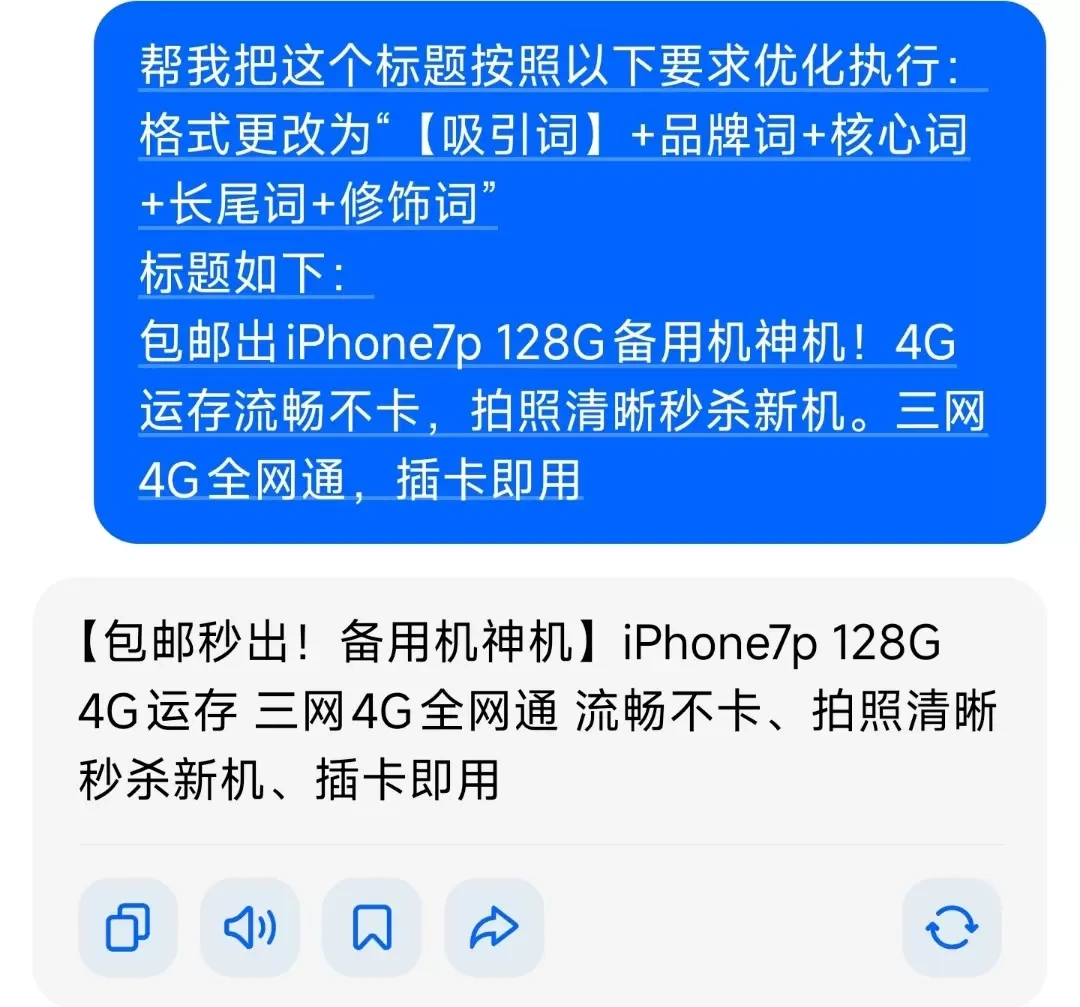 - 收录同行爆款:提前收录闲鱼同类爆款标题(如“备用机iPhone7p”),作为AI素材——爆款关键词已验证,能提升曝光概率。