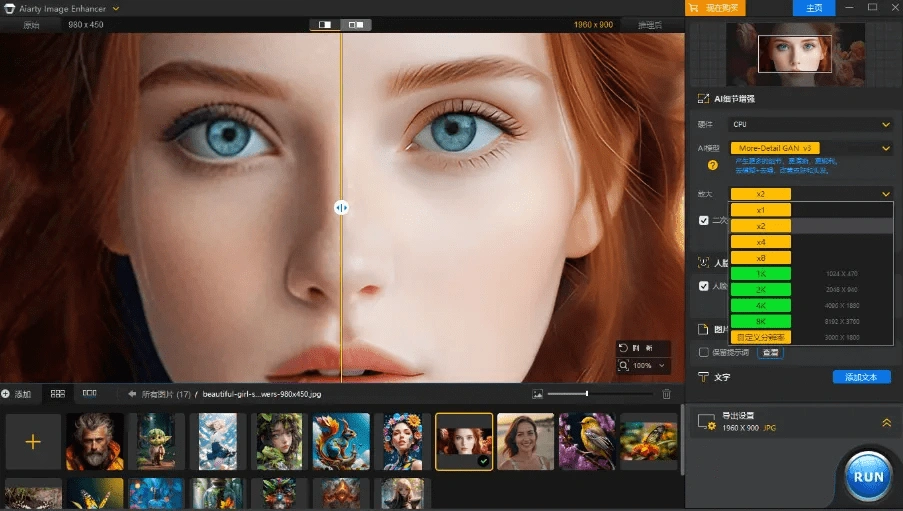 - 超清无损放大:不仅仅是放大,而是通过AI算法填补像素,消除压缩伪影、噪点和马赛克,将低清图片提升至 4K、8K 甚至 16K 分辨率。