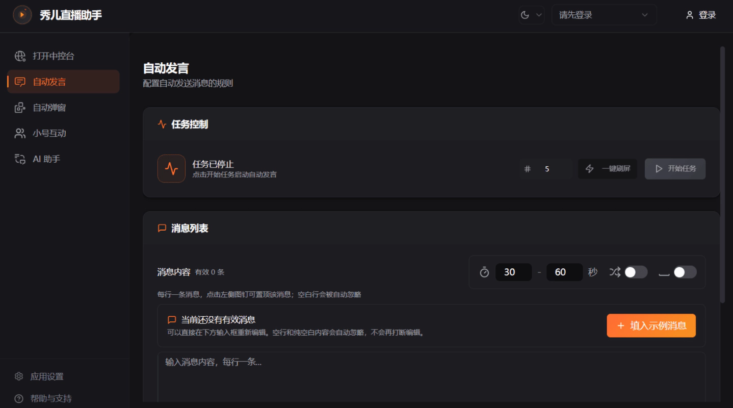 - 模板变量:预设消息支持随机组合,模拟真人互动氛围,活跃直播间气氛。