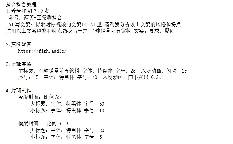 告别盲目起号,教程提供一套标准的养号流程,快速提升账号权重与标签精准度,为后续流量爆发打好基础。 - AI文案生成(提效10倍):