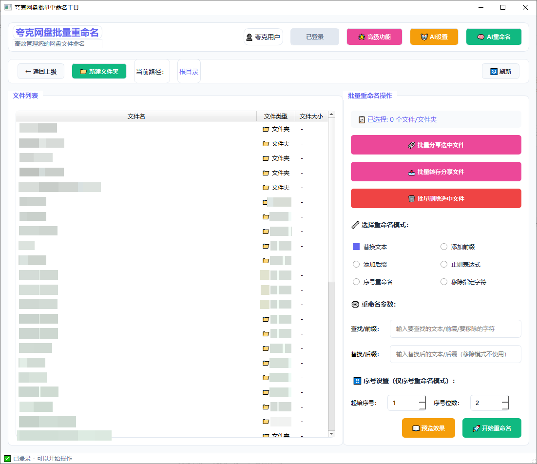 对于经常使用夸克网盘存储资源的用户来说,手动整理文件夹、逐个重命名文件无疑是巨大的时间浪费。这款夸克网盘批量文件重命名工具专为解决“文件杂乱、操作繁琐”的痛点而生。作为一款免安装绿色版软件,它不仅支持批量转存夸克文件、批量删除文件/文件夹,更引入了AI重命名技术,配合“自动保存CK”功能,实现了真正意义上的全自动挂机管理,是网盘运营和资源整理的必备效率工具。