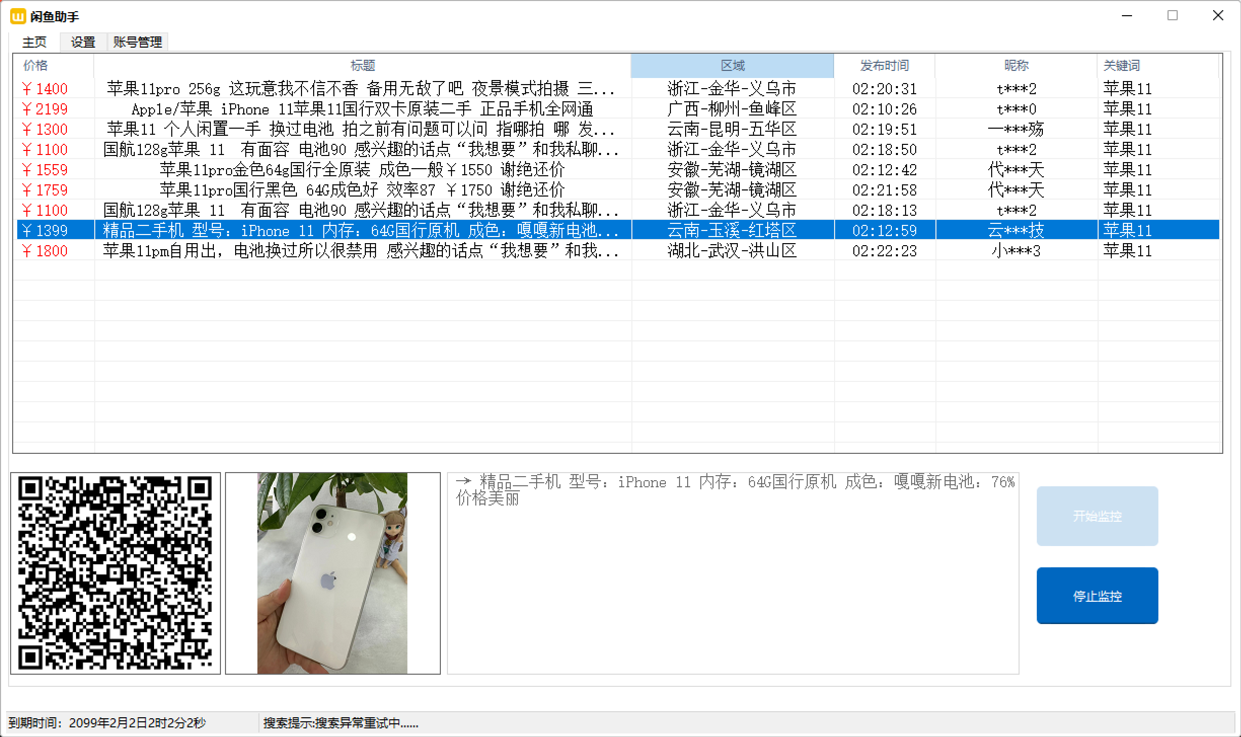 当前软件可以实时在线自动采集咸鱼用户最新发布的商品,并且支持自定义设置采集关键词,比如可以采集手机,电器,游戏装备等等任意闲鱼支持售卖的商品,简单点来说,也就是用户刚发布出来的商品,软件就能直接采集出来了,如果采集出来刚好有自己心仪的商品,可以直接用手机闲鱼APP扫软件左侧的商品二维码去闲鱼内与商家去了解商品详细信息了,第一时间就可以获取到,也算是一款捡漏助手软件。