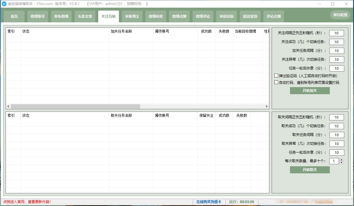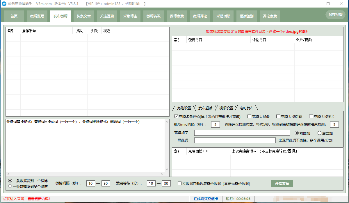 8.发布微博和超话支持/文字/图文/视频/克隆微博9.监控指定的微博,进行微博评论或对评论进行评论10.超话进行签到,如果没关注会先关注,然后在签到11.手动添加指定的微博,软件对微博中的评论进行点赞