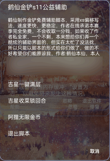 鹤仙金铲铲s11公益辅助也是升级为软件,里面有吉星一键满层,无线金币等功能,作者做这个不为别的,只为给那些想玩无限金币的小白提供一个既免费又稳定功能又多的辅助,在此作者承诺:本赛季不会收取一分钱,本赛季永远公益,收取一分钱,全家一夜暴毙,还是那句话初心就是想给你们一个免费有稳定的辅助,本人不指望用这个挣钱,本人也有自己的项目还有如果要是谁想开我这个辅助的话,尽情的开,你开了对我来说也无所谓,因为我本来就是免费,花那钱开的意义不大,我又不损失什么,有不会玩的小白的话,我争取就这几天出个教程,因为我一直在学习网络渗透没多大时间去做,所以敬请谅解,还是那句话,我做这个辅助不想招惹任何人,只是纯粹的给小白玩一下,行了话也不多说了