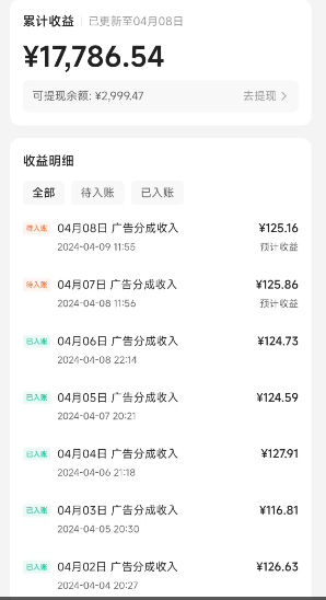 2-一个号收益多少: 你需要有账号开通了磁力万和!然后你通过小号,在手机上装这个脚本软件,输入你开通磁力万合账号ID就可以启动24小时工作自动刷视频了!然后我们测试的结果是一天就是10块8块到几十块钱每天!小号越多,你的收益就会越高,比如说你有十个小号,那你每天就躺赚,就是几百块钱!小号是没有任何粉丝和其他类要求的,只要是个快手号就行