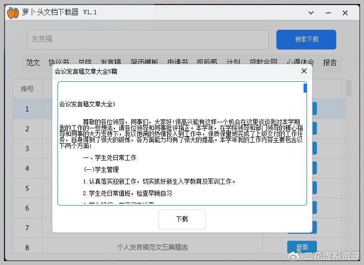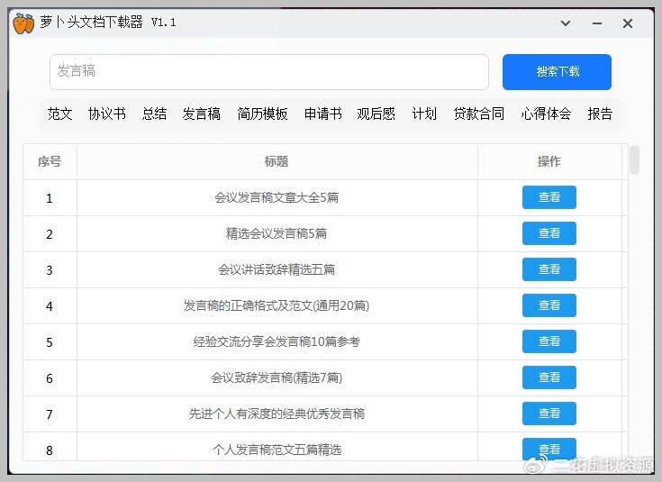 这款下载器设置了各种常见文档类型的关键词分类,包括范文、协议书、总结、发言稿、简历模板、申请书、观后感等等。只需点击对应的关键词,再点击“搜索下载”,即可轻松找到所需的丰富资源。