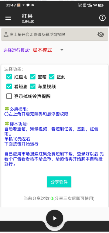 红果短剧自动看广告脚本,纯免费脚本,每天赚个15-20块是没问题的,多号多撸,这脚本唯一的缺点就是得分享三次QQ好友,这个好解决QQ分享给QQ里我的电脑,分享三次就OK了!