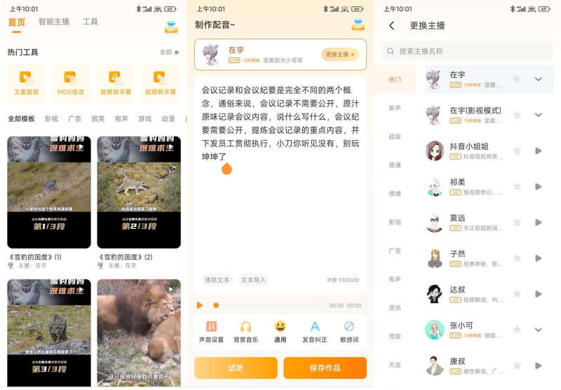 配音鸭APP一款专业的文字转语音配音APP,轻松几步即可生成高度拟人的智能配音,百位优质主播,AI模拟真人情绪,多种场景覆盖,轻轻松松配好音。