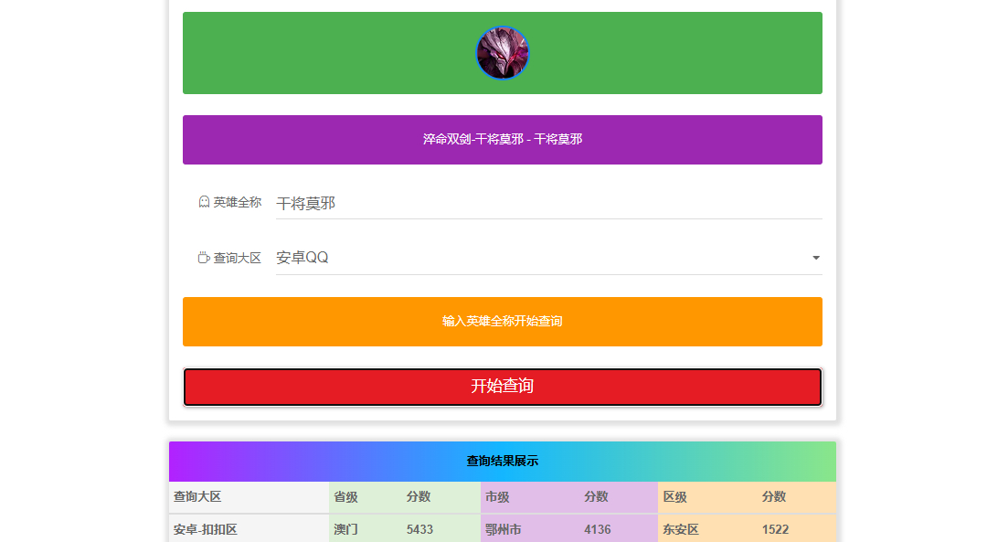 王者英雄最低战力在线一键查询HTML源码,本地双击打开或者上传到服务器都可以,输入英雄全称名字或者主要名字都可以,比如雷霆之王-司空震或者输入司空震都可以查询得到最低英雄排名战力,帮你更轻松的获取排名,网上很多相似的不过接口失效了,这个是修改了新的API接口,可以正常使用