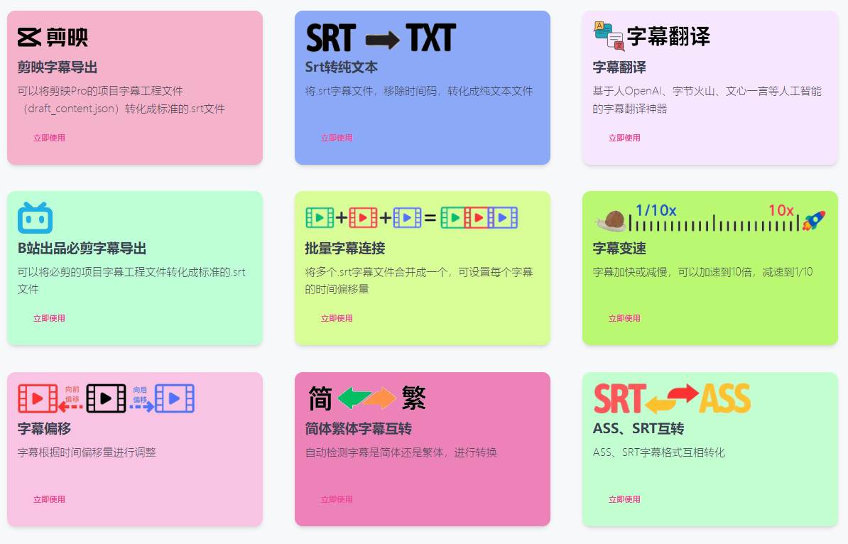 支持剪映字幕导出、SRT 转纯文本、字幕连接、字幕偏移、双语字幕等功能,采用前端处理的方式,不会上传到服务器,完全免费,无需注册。