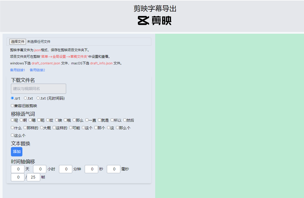 - 支持剪映字幕导出、SRT 转纯文本、字幕连接、字幕偏移、双语字幕等功能、