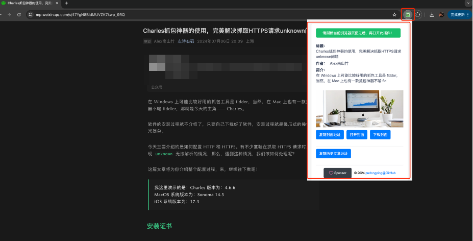 微信公众号小助手,扩展了一键获取微信公众号文章封面图、全部文章、一键采集文章内容等功能。