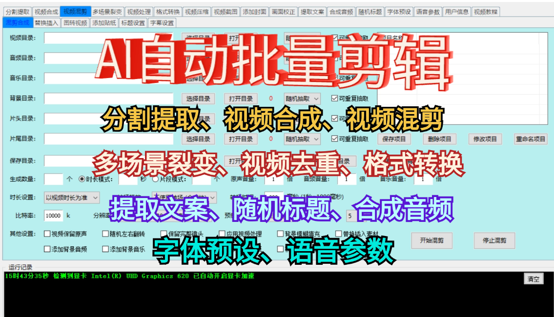- 视频处理:可以根据用户设置的参数和勾选的功能来自动化批量处理视频,给每个视频添加对应的处理效果